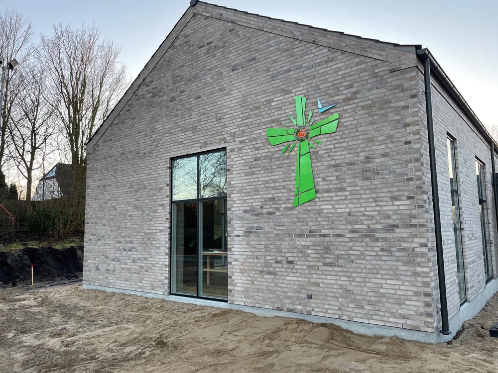 Det flotte grønne kors på kirkens facade er på plads og nu står bygningen endelig helt klar.