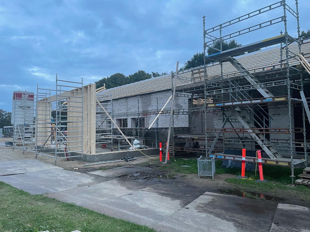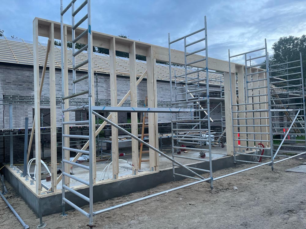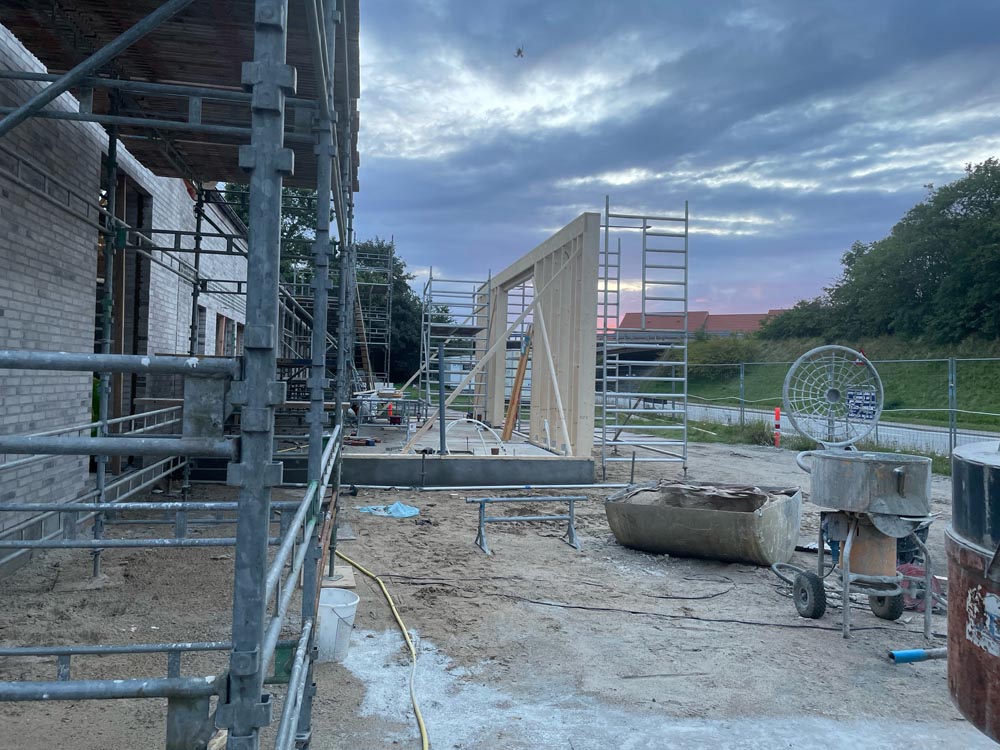 Så begynder vores nye kirke på Sæbygaardvej at tage form. I disse dage er tømrene begyndt på hvad der bliver indgangen til vores nye kirke på Sæbygaardvej i Sæby