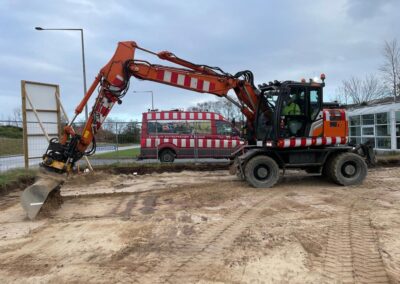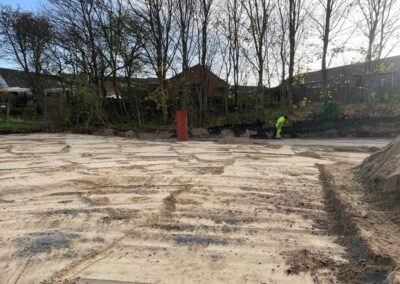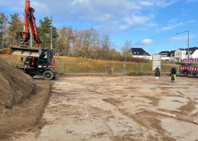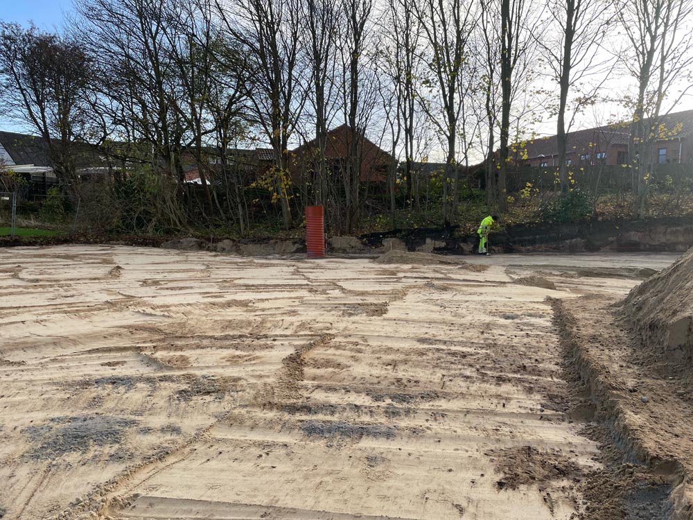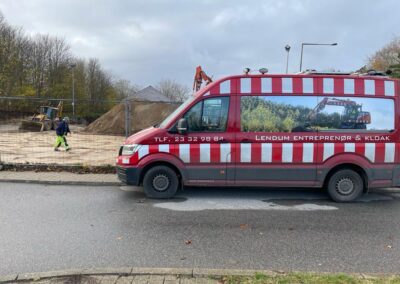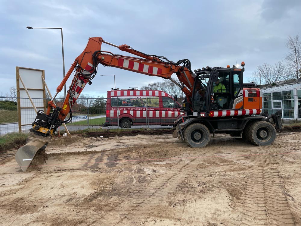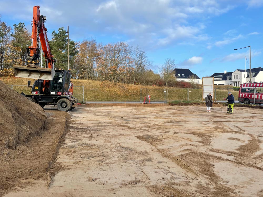 Sæby Baptistkirkes nye kirke på Sæbygaardvej i Sæby tager form. Lige nu er det parkeringspladsen der er ved at blive jævnet, men dkorrekt fald til afløb med mede.