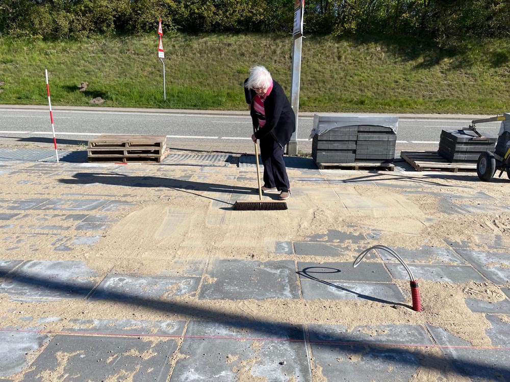 Mens vi gik og lagde fliser kom Lizzi for tidligt til tirsdagskaffe, og havde ikke noget at lave, tog hun kosten, og fejede sand i rillerne mellem fliserne.